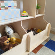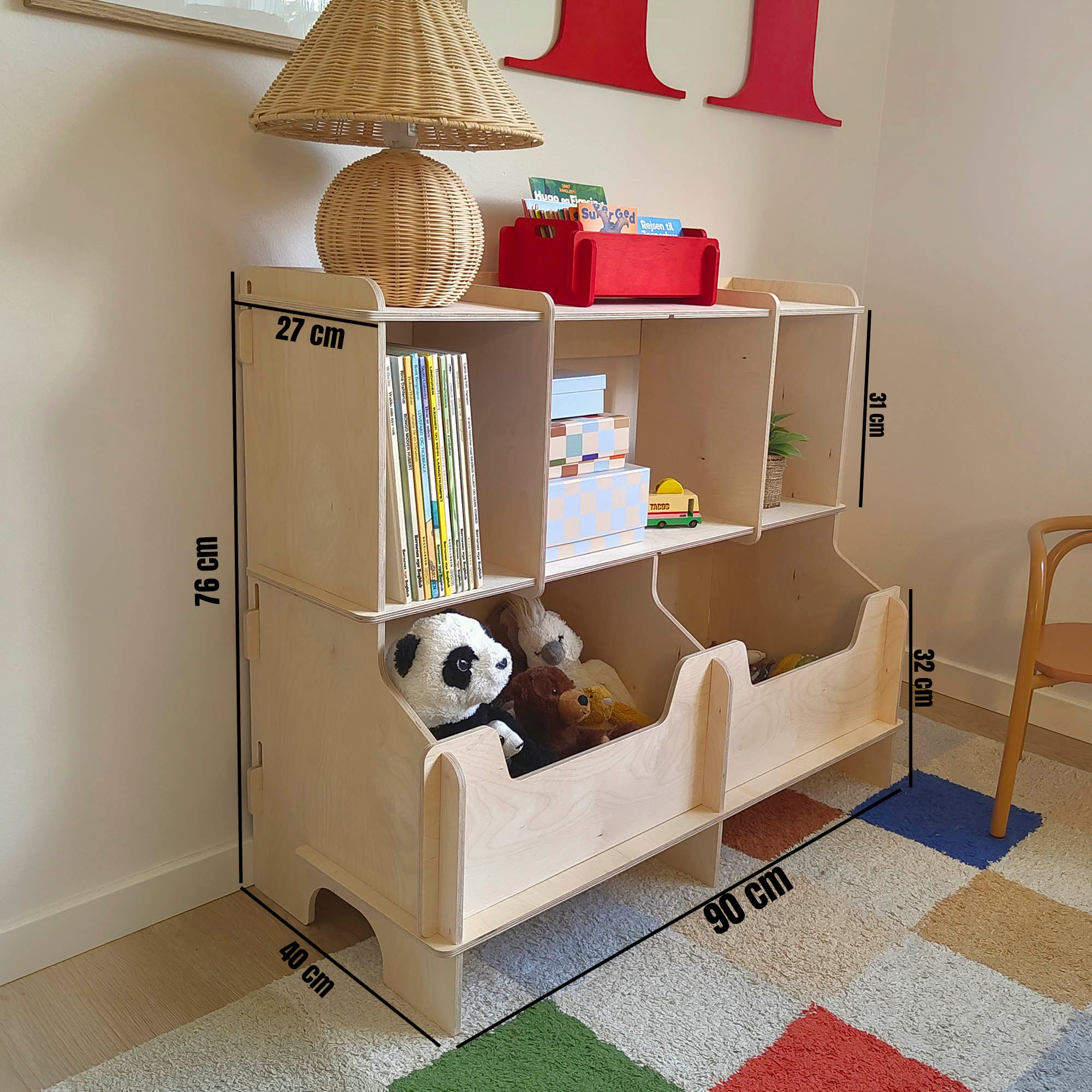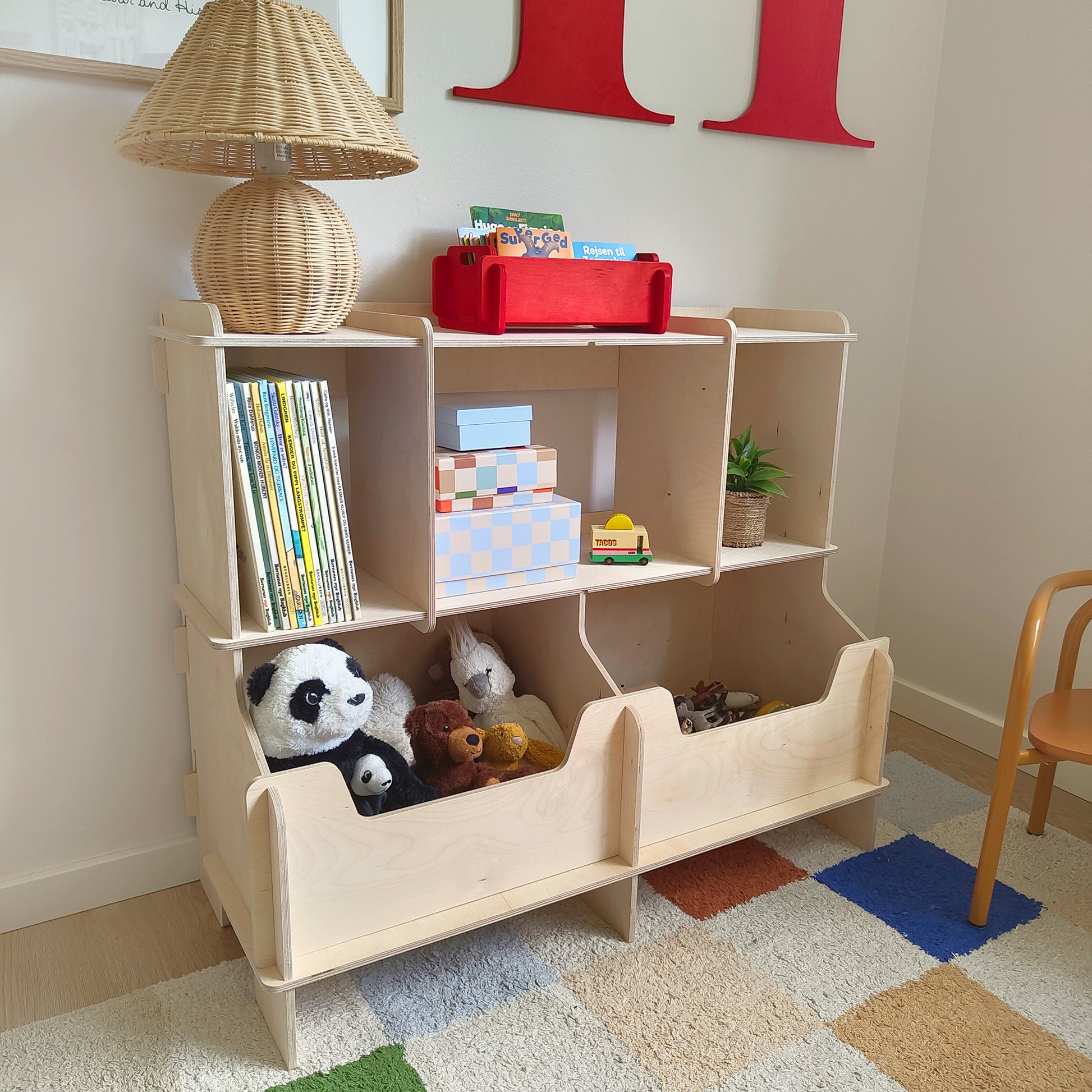 Sag Hallo zu Saxo, unserem cleveren Regal für Kinderzimmer. Mit zwei großen Aufbewahrungsboxen unten und Regalböden in kindgerechter Höhe können Kinder von 1–6 Jahren ihre Lieblingsbücher, Kuscheltiere und Spielzeuge selbst erreichen – und genauso leicht wieder aufräumen.