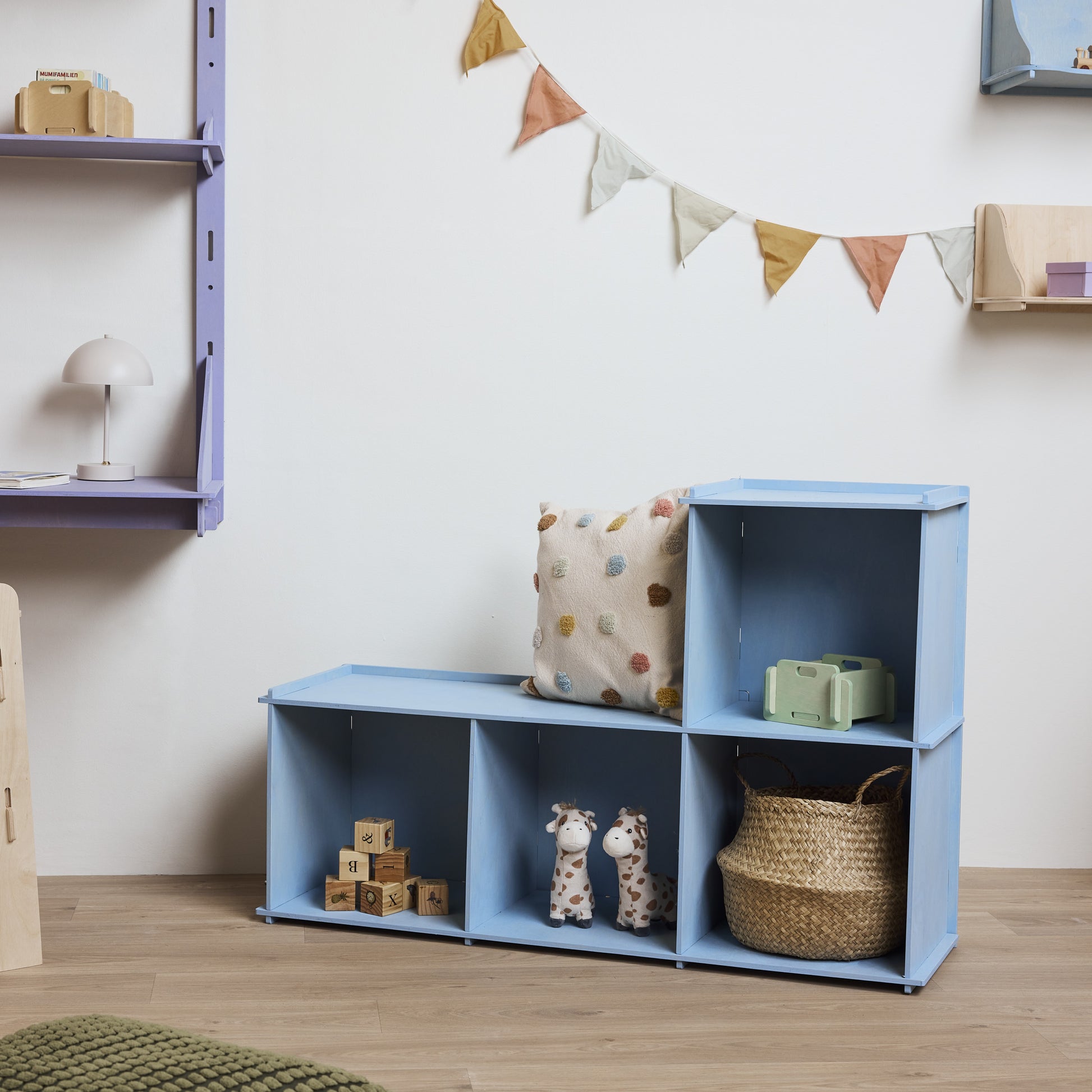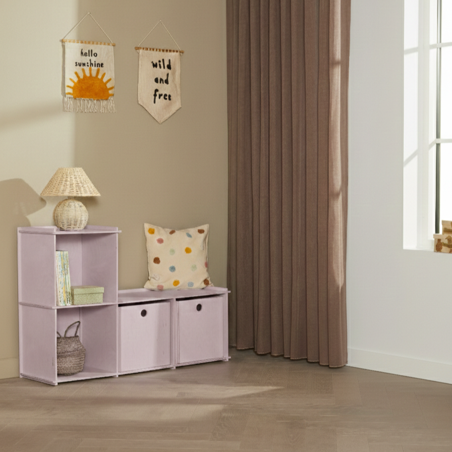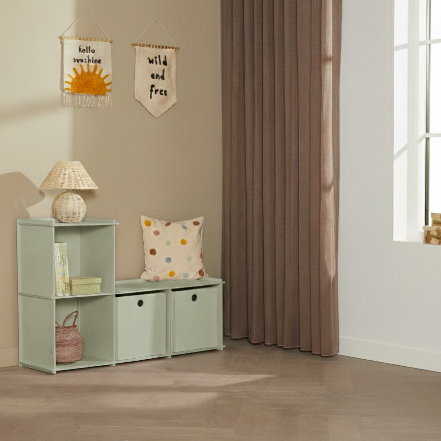 Bücherregal, Bank, Spieltisch. Wir haben versucht, ein multifunktionelles Möbelstück zu schaffen, das viel Stauraum für all die Dinge im Zimmer Ihres Kindes bietet. Mit viel Platz für Bücher, Spiele, Aufbewahrungsboxen und vieles, vieles mehr.