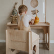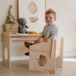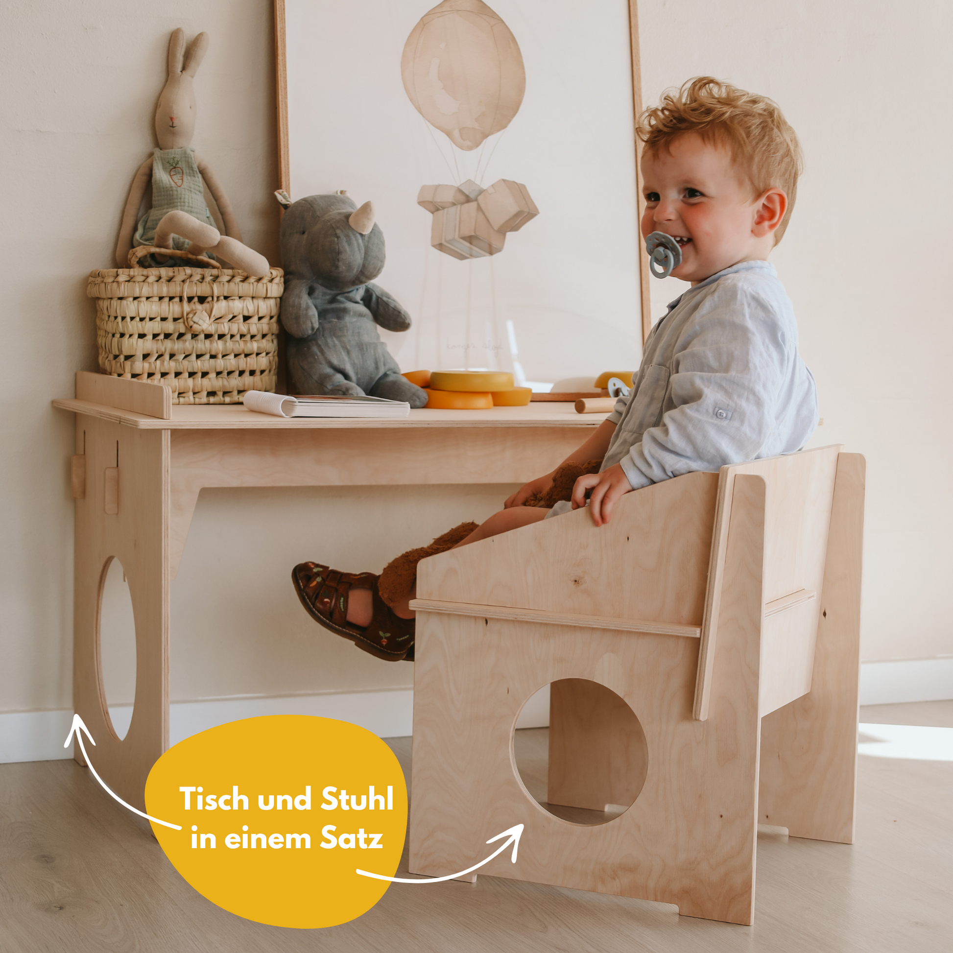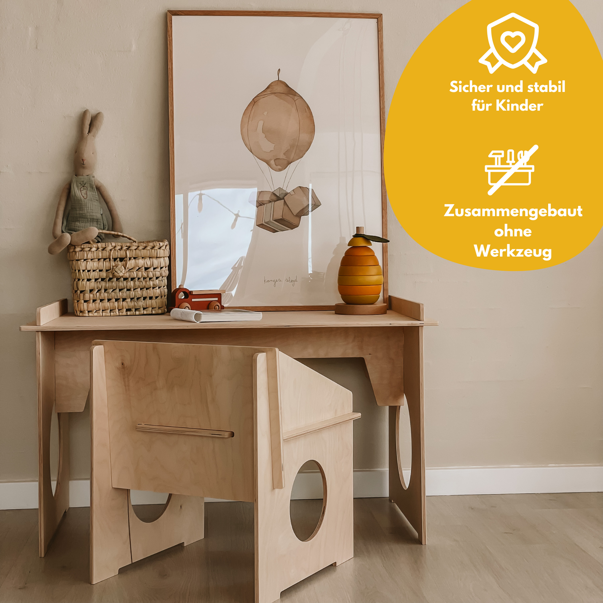 Mit seinem schlichten und hellen Design passt der Tisch perfekt in die meisten Kinderzimmer. Der Stuhl kann problemlos unter den Tisch geschoben werden, sodass er bei Nichtgebrauch keinen Platz auf dem Boden einnimmt.
